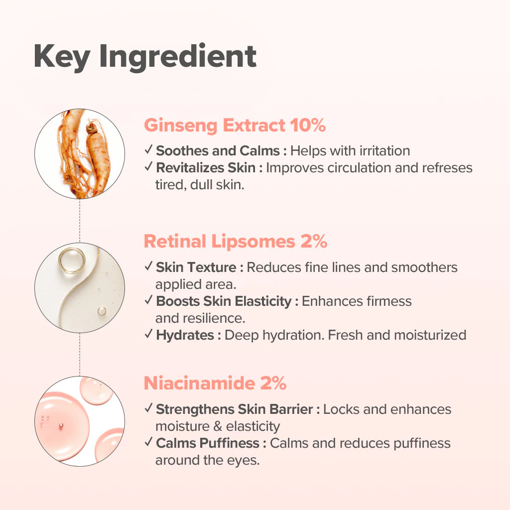 GingsengĀ efektif dalam menghilangkan kerutan karenaĀ kaya akanĀ saponin, dan 2% (bahan aktif 0,02%) retinal yang distabilkan dalam bentuk liposom dicampur ke dalam formula.