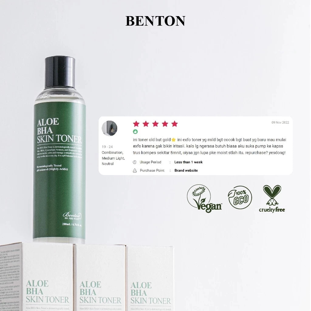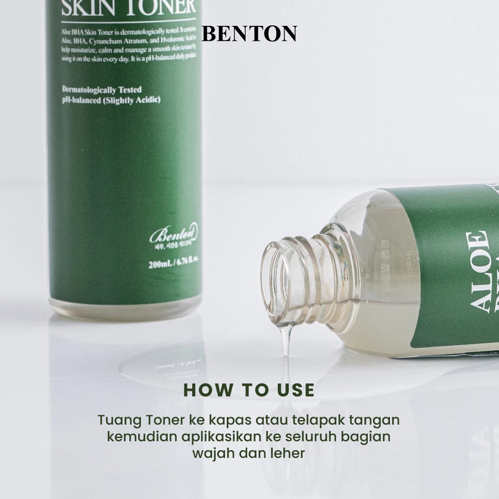 Benton Aloe BHA Skin Toner berfungsi untuk mengangkat sel kulit mati serta kotoran dari pori-pori sekaligus menutrisi dan menjaga kelembaban kulit sepanjang hari. Toner ini baik untuk semua jenis kulit karena mengandung 81% Aloe Vera dan 0,49% Salicylic Acid sehingga dikategorikan sebagai toner eksfoliasi yang ringan dan dapat digunakan untuk sehari-hari. Toner ini memberikan sensasi dingin dan menenangkan ke kulit dari kandungan botanical yang terkandung.
