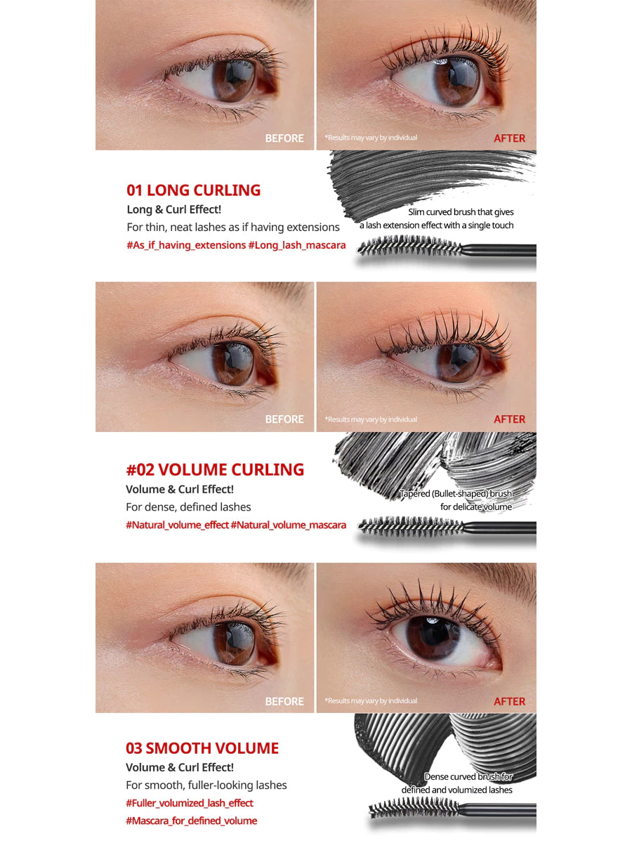 Maskara yang dapat menjadikan bulu mata tampak lebih lentik, panjang, dan tebal. Memiliki bulu sikat yang fleksibel yang mampu untuk melentikkan bulu mata dari akarnya untuk menjadikan bulu mata tetap lentik seharian dan tidak menggumpal.