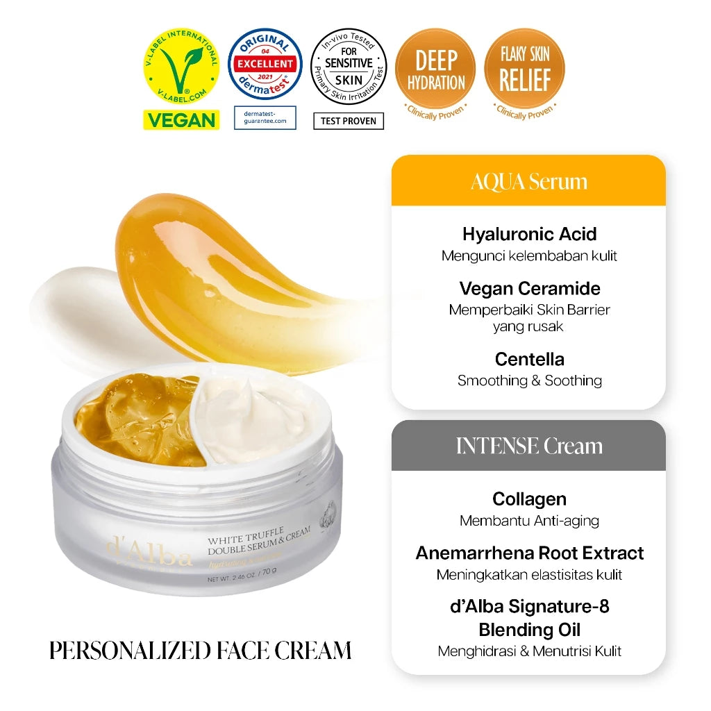 - Produk perawatan wajah ini dengan dual formula (dua jenis tekstur cream) dalam satu kemasan, yang dirancang untuk memberikan kelembapan dan nutrisi yang dibutuhkan kulit.