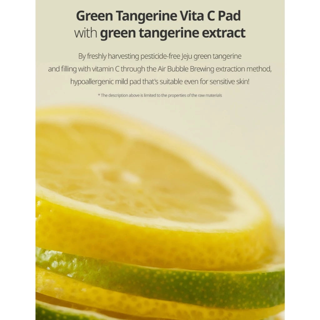 Menggunakan jeruk tangerine organik yang dipupuk dengan kedelai fermentasi alami untuk hasil yang lebih sehat dan berkualitas. Jeruk dipetik secara manual hanya selama 4 minggu di bulan Juli, saat kandungan vitamin C-nya paling tinggi. Hanya buah paling segar yang digunakan dalam formula untuk menciptakan toner pads dengan manfaat maksimal untuk kulit.
