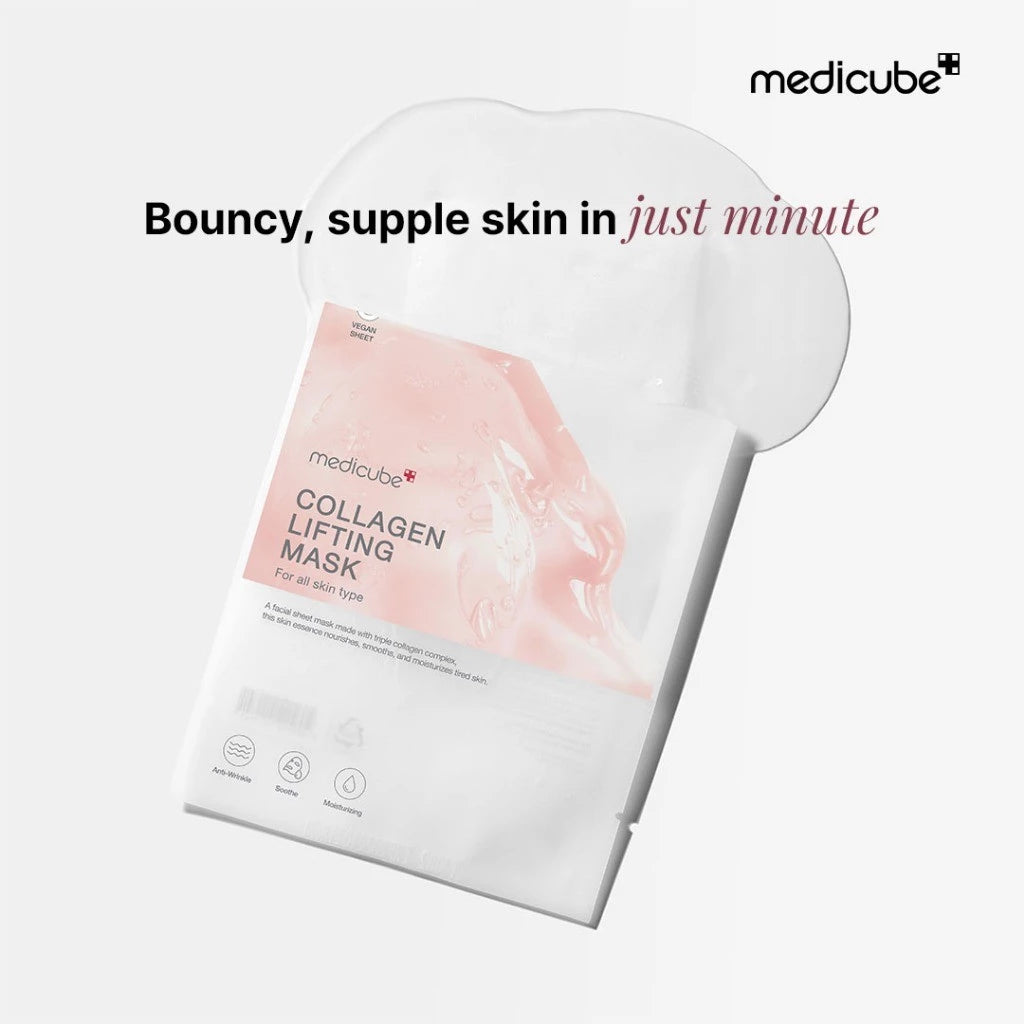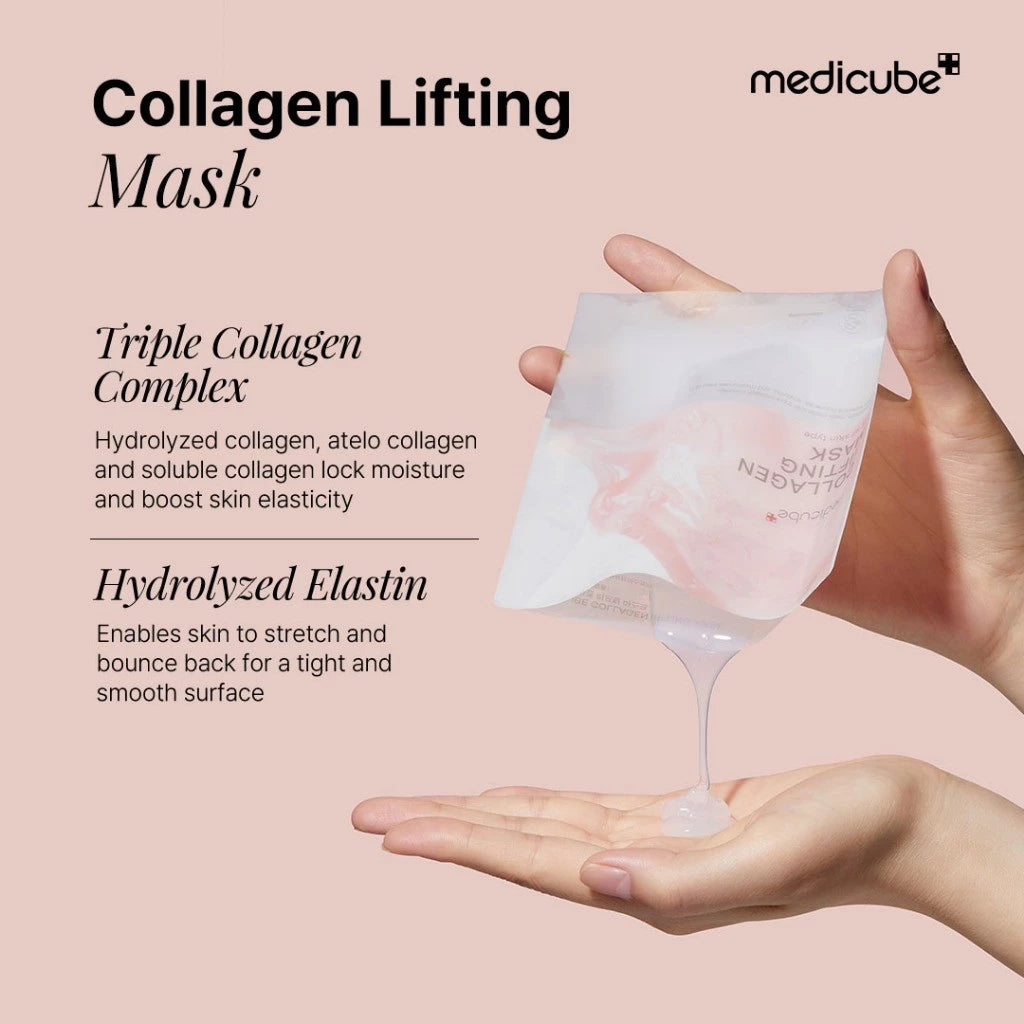 Medicube Collagen Lifting Mask diperkaya Triple Collagen Complex & 8 jenis Hyaluronic Acid untuk mengencangkan, melembapkan, dan memberi efek lifting secara instan. Lembaran masker vegan yang tipis membalut wajah sempurna, membantu essence meresap maksimal. Kulit terasa kenyal, halus, dan bercahaya hanya dalam sekali pakai.