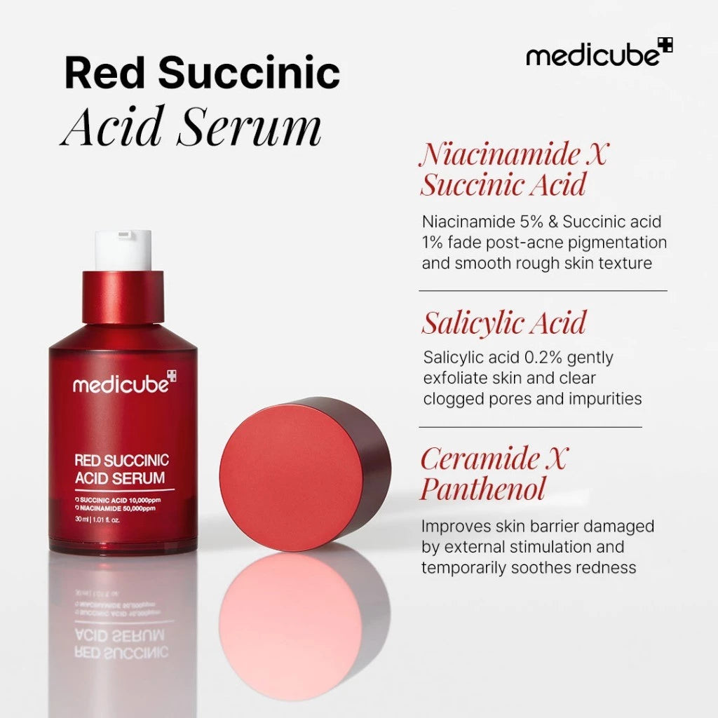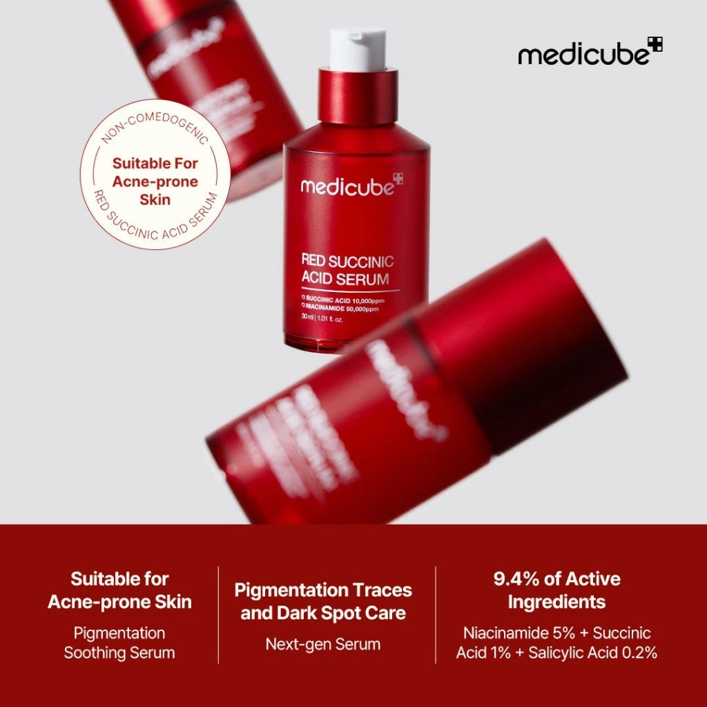 Medicube Red Succinic Acid Serum adalah serum eksfoliasi ringan yang efektif untuk mengatasi jerawat aktif, komedo, pori tersumbat, dan bekas jerawat. Dengan kombinasi bahan aktif seperti Succinic Acid, Salicylic Acid, dan Niacinamide, serum ini membantu memperbaiki tekstur kulit, mengontrol minyak, dan memperkuat skin barrier.