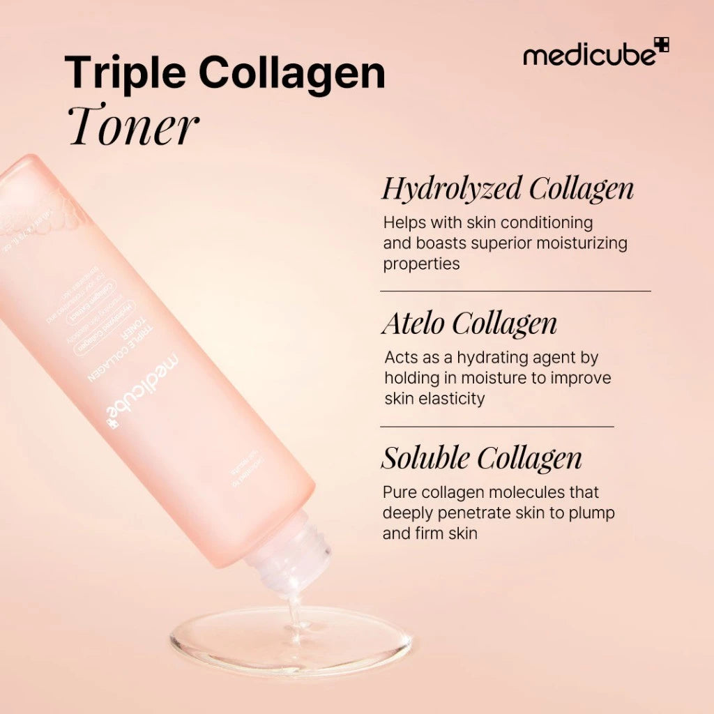 Medicube Triple Collagen Toner 4.0 mengandung tiga jenis kolagen yang membantu kulit jadi lebih kencang dan elastis. Dilengkapi dengan Hyaluronic Acid untuk hidrasi maksimal dan ekstrak Centella Asiatica yang menenangkan serta meredakan kemerahan.