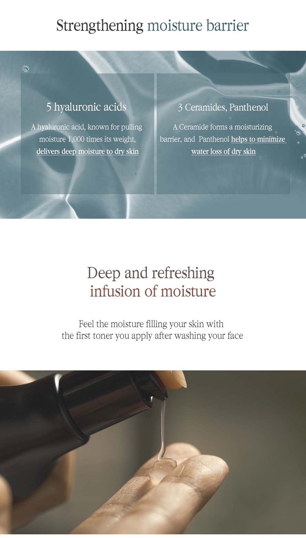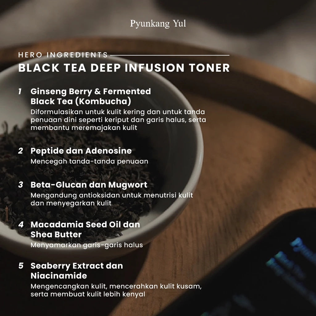 Black Tea Deep Infusion Toner mengandung bahan utama Ginseng Root dan fermented Black Tea (Kombucha) yang diformulasikan untuk kulit yang kering serta memiliki tanda-tanda penuaan seperti keriput dan garis halus. Ginseng Root dapat menutrisi dan meremajakan kulit. Sedangkan Kombucha yang telah difermentasi selama 7-30 hari mengandung banyak nutrisi seperti Polyphenol dan Catechin yang dapat membuat kulit terasa lebih kencang dan lembut. Selain itu, diperkaya juga dengan Mugwort untuk menyegarkan kulit, Peptide dan Adenosine yang dapat mencegah tanda-tanda penuaan, Beta-Glucan yang kaya akan antioksidan untuk menutrisi kulit, Macadamia Seed Oil dan Shea Butter untuk menyamarkan garis-garis halus, serta Seaberry Extract dan Niacinamide untuk mencerahkan kulit yang kusam. Dengan penggunaan secara rutin, kulit akan tampak cerah, kencang, dan kenyal.