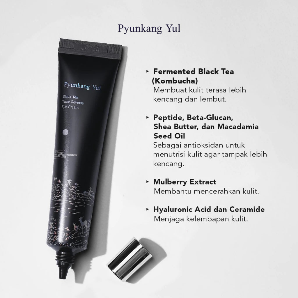 Black Tea Reverse Eye Cream diformulasikan untuk menjaga keremajaan kulit dan menyamarkan garis halus pada area mata yang kusam dan kendur. Dengan bahan utama fermented Black Tea (Kombucha) yang telah difermentasi selama 7-30 hari, eye cream ini mampu membuat kulit terasa lebih kencang dan lembut. Diperkaya dengan 2 jenis Peptide, Beta-Glucan, Shea Butter, dan Macadamia Seed Oil yang penuh dengan nutrisi dan antioksidan agar kulit dapat tampak lebih kencang. Selain itu terkandung juga Mulberry Extract yang dapat membantu mencerahkan kulit, serta 3 jenis Hyaluronic Acid dan Ceramide untuk menjaga kelembapan kulit.
