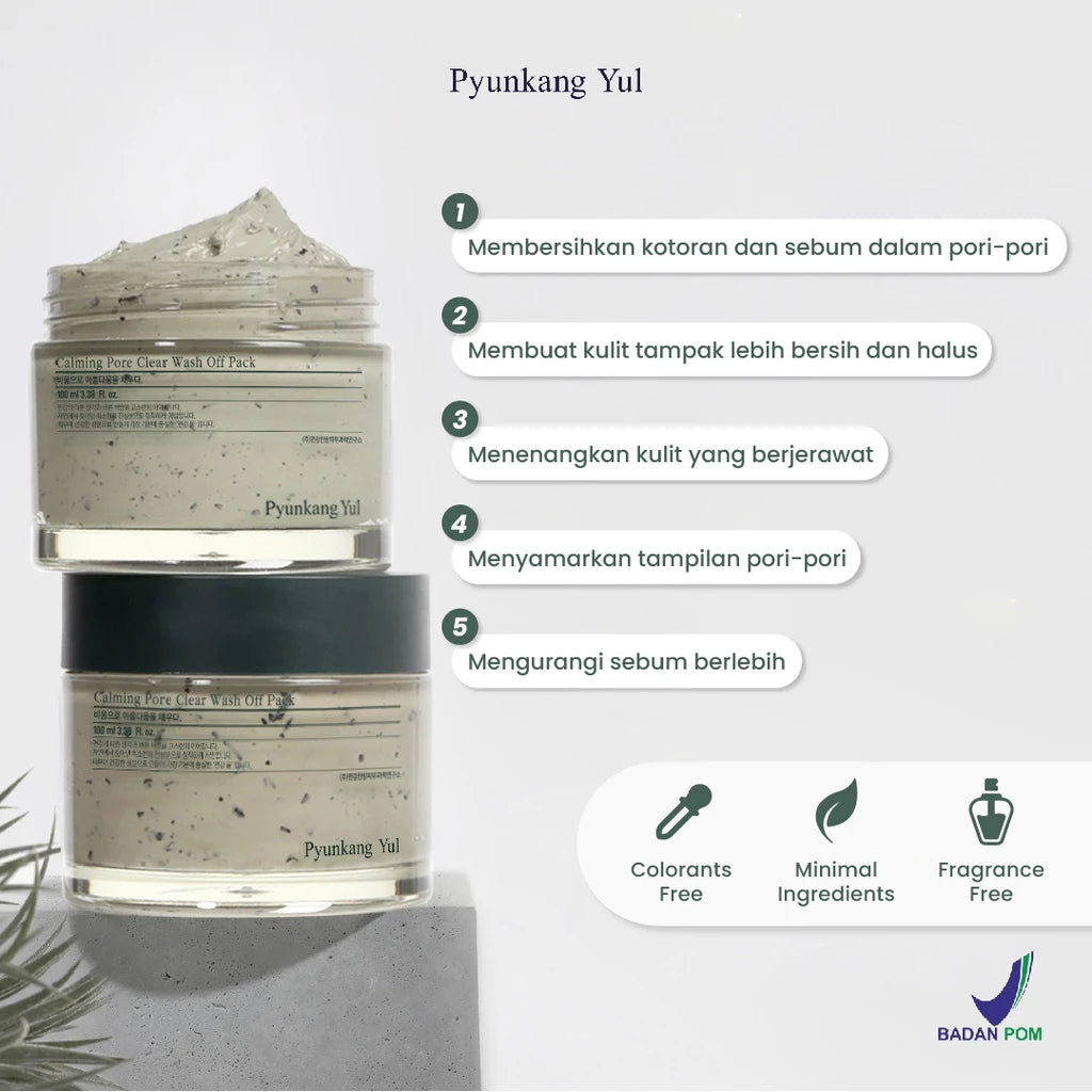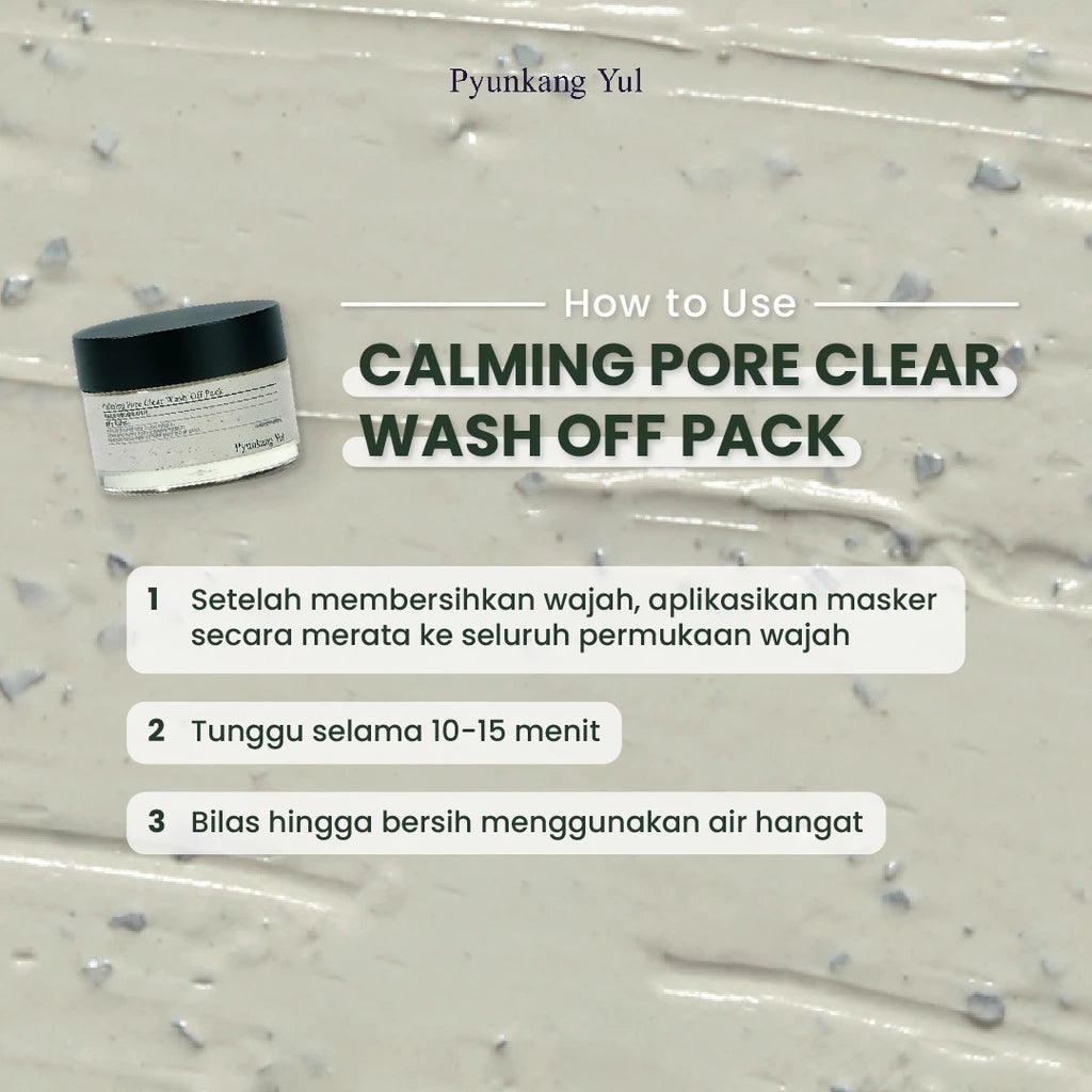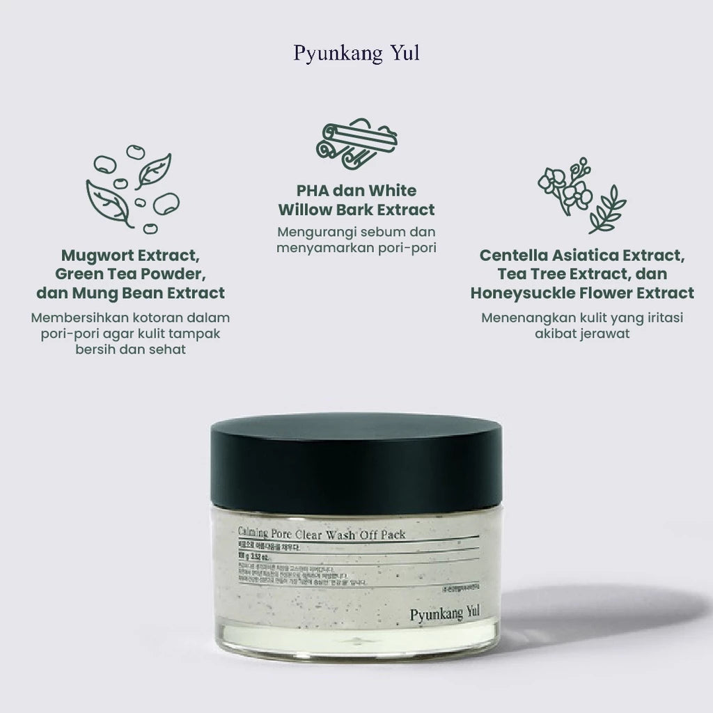 Calming Pore Clear Wash Off Pack adalah masker bilas dengan kandungan utama Mugwort Extract, Green Tea Powder, dan Mung Bean Extract untuk membersihkan kotoran dalam pori-pori agar kulit tampak lebih bersih dan sehat. Diperkaya juga dengan PHA dan ekstrak White Willow Bark yang mampu untuk mengurangi sebum berlebih dan menyamarkan pori-pori, serta Centella Asiatica Extract, Tea Tree Extract, dan Honeysuckle Flower Extract yang bekerjasama untuk menenangkan kulit yang iritasi akibat jerawat.