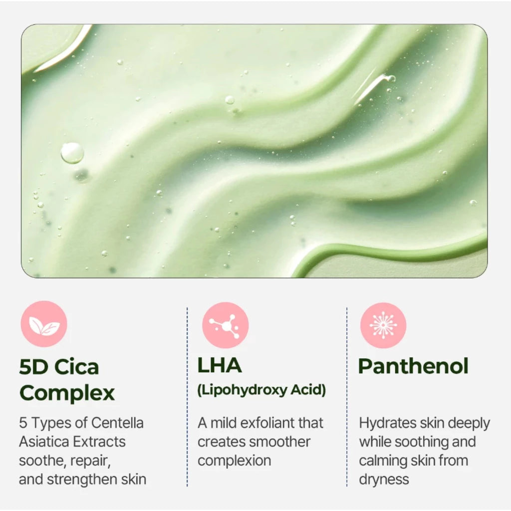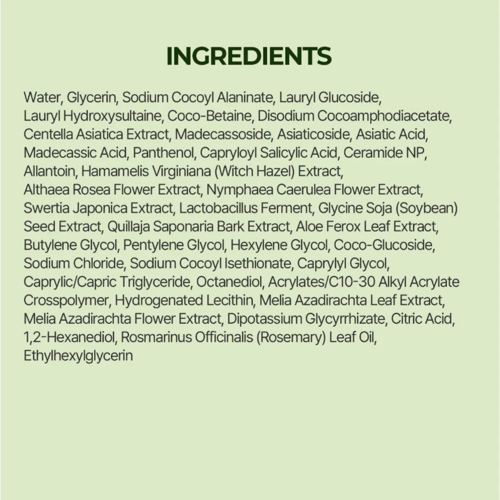 Water, Glycerin, Sodium Cocoyl Alaninate, Lauryl Glucoside, Lauryl Hydroxysultaine, Coco-Betaine, Disodium Cocoamphodiacetate, Centella Asiatica Extract, Madecassoside, Asiaticoside, Asiatic Acid, Madecassic Acid, Panthenol, Capryloyl Salicylic Acid, Ceramide NP, Allantoin, Hamamelis Virginiana (Witch Hazel) Extract, Althaea Rosea Flower Extract, Nymphaea Caerulea Flower Extract, Swertia Japonica Extract, Lactobacillus Ferment, Glycine Soja (Soybean) Seed Extract, Quillaja Saponaria Bark Extract, Aloe Ferox Leaf Extract, Butylene Glycol, Pentylene Glycol, Hexylene Glycol, Coco-Glucoside, Sodium Chloride, Sodium Cocoyl Isethionate, Caprylyl Glycol, Caprylic/Capric Triglyceride, Octanediol, Acrylates/C10-30 Alkyl Acrylate Crosspolymer, Hydrogenated Lecithin, Melia Azadirachta Leaf Extract, Melia Azadirachta Flower Extract, Dipotassium Glycyrrhizate, Citric Acid, 1,2-Hexanediol, Rosmarinus Officinalis