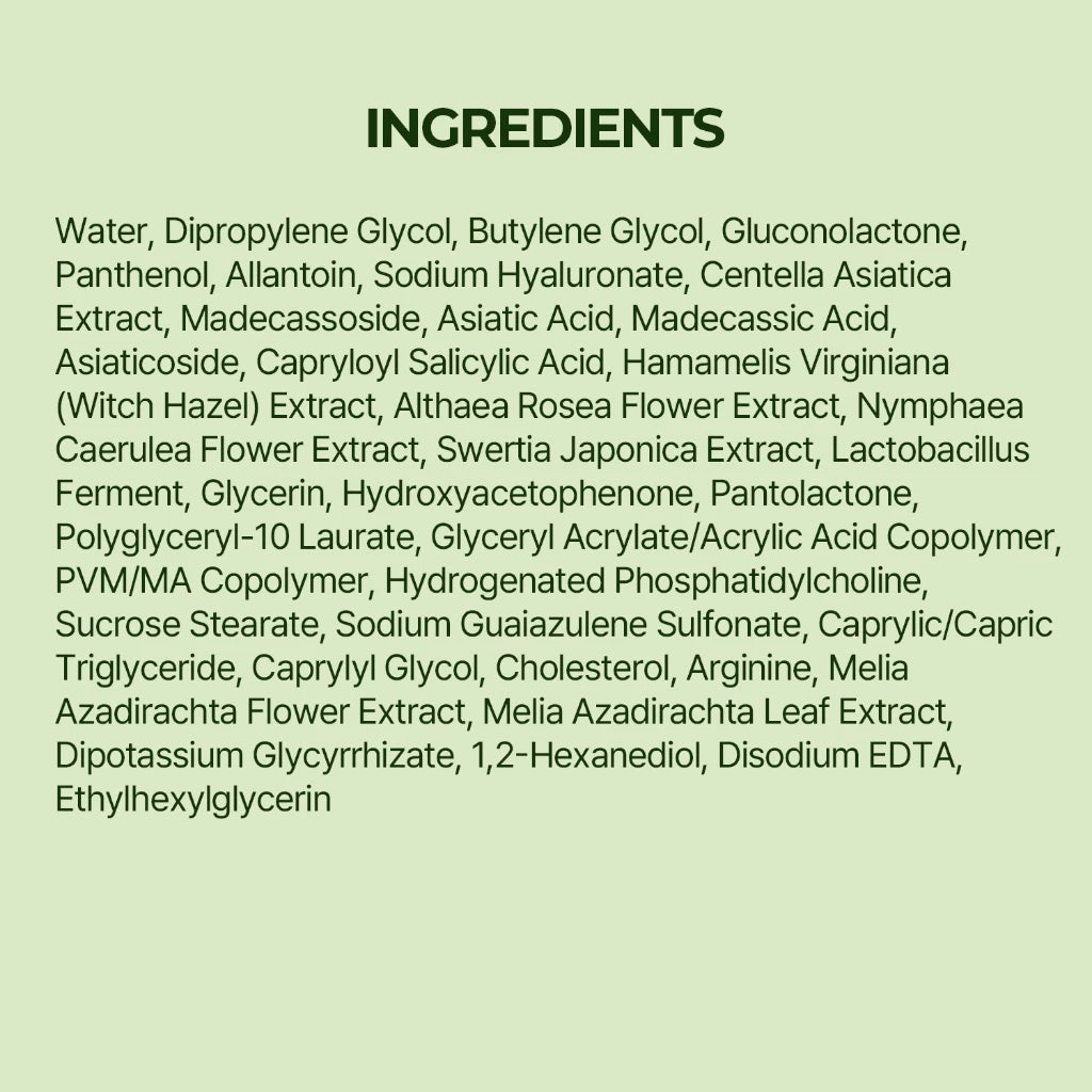 Water, Dipropylene Glycol, Butylene Glycol, Gluconolactone, Panthenol, Allantoin, Sodium Hyaluronate, Centella Asiatica Extract, Madecassoside, Asiatic Acid, Madecassic Acid, Asiaticoside, Capryloyl Salicylic Acid, Hamamelis Virginiana (Witch Hazel) Extract, Althaea Rosea Flower Extract, Nymphaea Caerulea Flower Extract, Swertia Japonica Extract, Lactobacillus Ferment, Glycerin, Hydroxyacetophenone, Pantolactone, Polyglyceryl-10 Laurate, Glyceryl Acrylate/Acrylic Acid Copolymer, PVM/MA Copolymer, Hydrogenated Phosphatidylcholine, Sucrose Stearate, Sodium Guaiazulene Sulfonate, Caprylic/Capric Triglyceride, Caprylyl Glycol, Cholesterol, Arginine, Melia Azadirachta Flower Extract, Melia Azadirachta Leaf Extract,