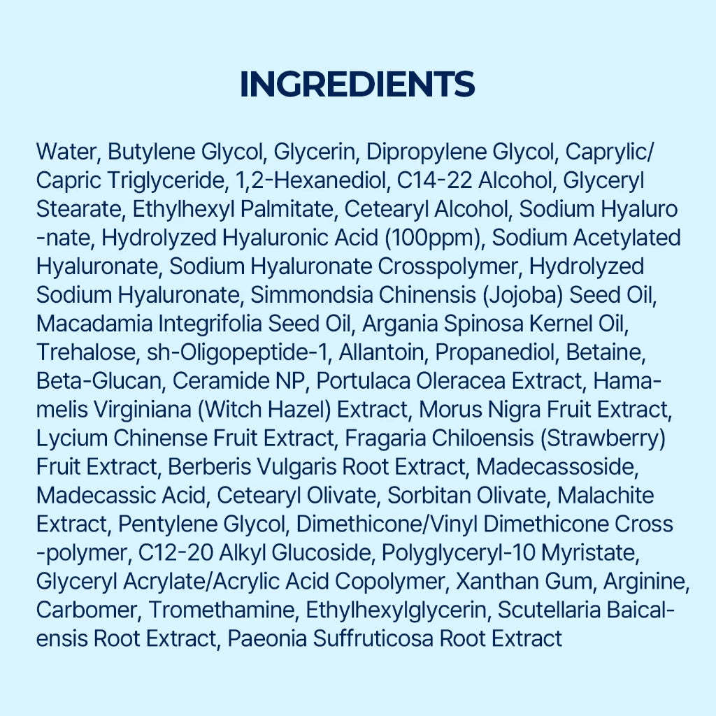 Water, Butylene Glycol, Glycerin, Dipropylene Glycol, Caprylic/Capric Triglyceride, 1,2-Hexanediol, C14-22 Alcohols, Glyceryl Stearate, Ethylhexyl Palmitate, Cetearyl Alcohol, Sodium Hyaluronate, Hydrolyzed Hyaluronic Acid, Sodium Acetylated Hyaluronate, Sodium Hyaluronate Crosspolymer, Hydrolyzed Sodium Hyaluronate, Simmondsia Chinensis (Jojoba) Seed Oil, Macadamia Ternifolia Seed Oil, Argania Spinosa Kernel Oil, Trehalose, Sh-Oligopeptide-1, Allantoin, Propanediol, Betaine, Beta-Glucan, Ceramide NP, Portulaca Oleracea Extract, Hamamelis Virginiana (Witch Hazel) Leaf Extract, Morus Nigra Fruit Extract, Lycium Chinense Fruit Extract, Fragaria Chiloensis (Strawberry) Fruit, Extract, Berberis Vulgaris Root Extract, Madecassoside, Madecassic Acid, etearyl Olivate, Sorbitan Olivate, Malachite Extract, Pentylene Glycol, Dimethicone/Vinyl Dimethicone Crosspolymer, C12-20 Alkyl Glucoside, Polyglyceryl-10 Myristate, Glyceryl Acrylate/Acrylic Acid Copolymer, Xanthan Gum, Arginine, Carbomer, romethamine, thylhexylglycerin, Scutellaria Baicalensis Root Extract, Paeonia Suffruticosa Root Extract