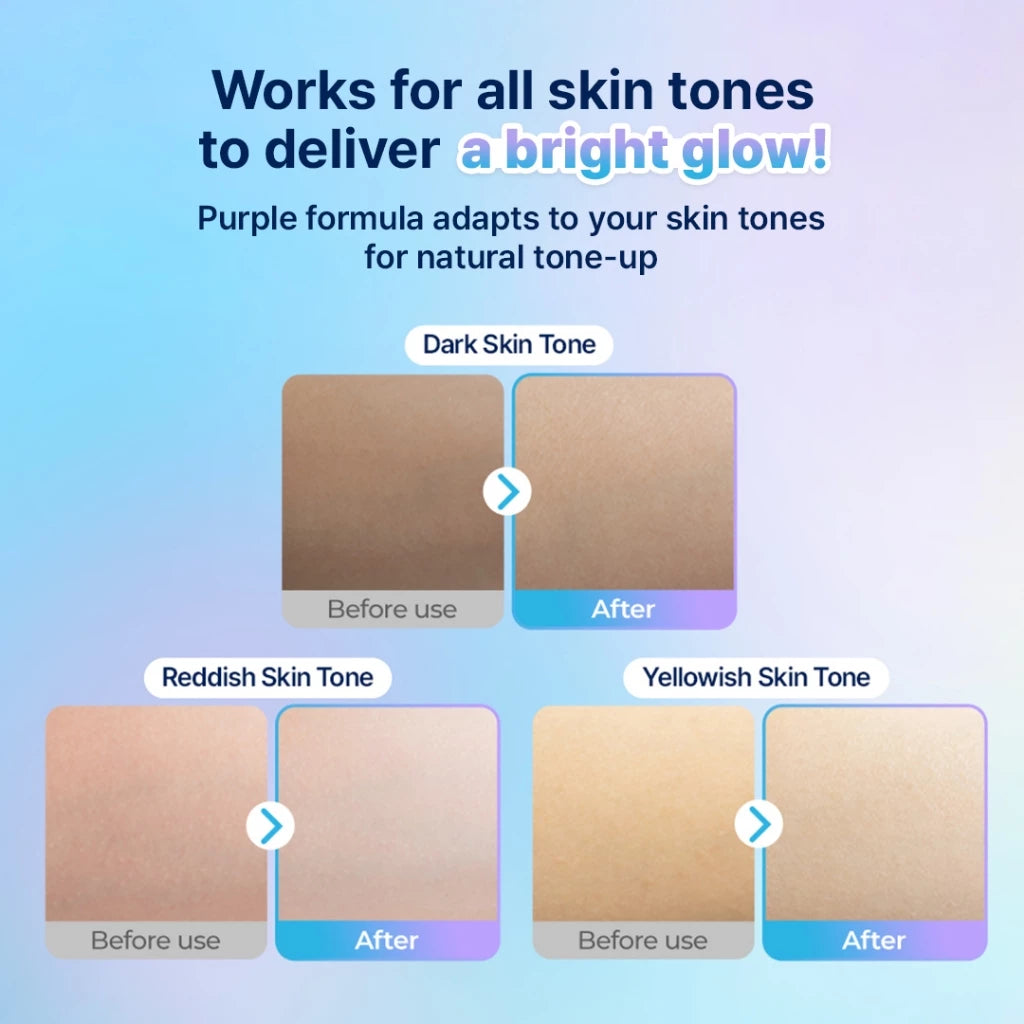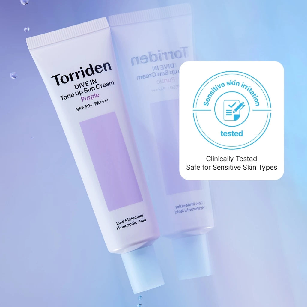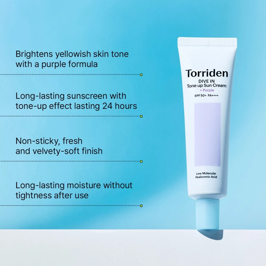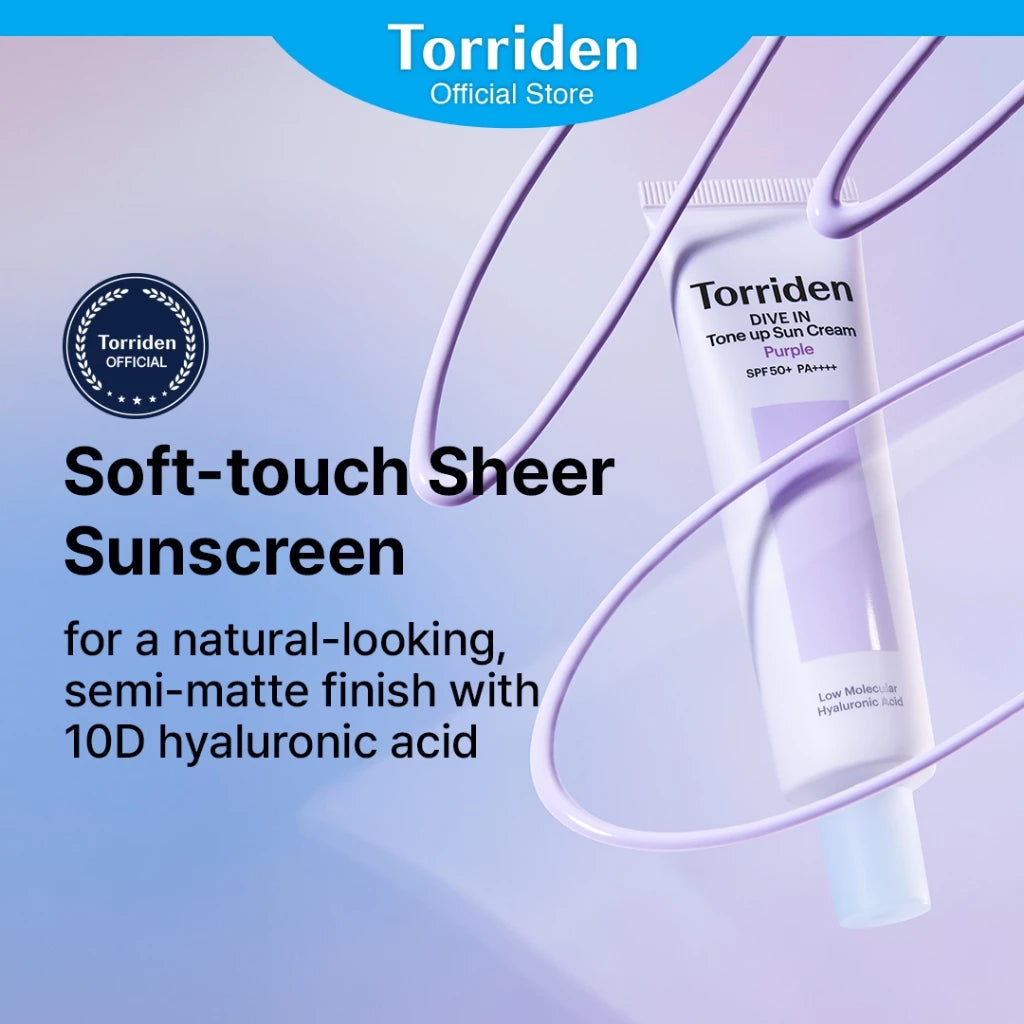 Torriden Dive In Tone Up Sun Cream Purple adalah sunscreen tone-up berwarna lilac yang dirancang untuk menyamarkan kusam, meratakan warna kulit, dan memberikan efek brightening natural tanpa whitecast.