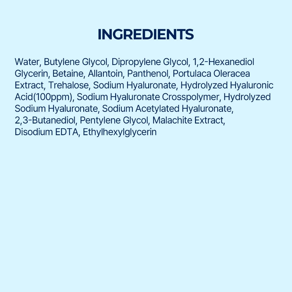 Water, Butylene Glycol, Dipropylene Glycol, 1,2-Hexanediol, Glycerin, Betaine, Allantoin, Panthenol, Portulaca Oleracea Extract, Trehalose, Sodium Hyaluronate, Hydrolyzed Hyaluronic Acid(100ppm), Sodium Hyaluronate Crosspolymer, Hydrolyzed Sodium Hyaluronate, Sodium Acetylated Hyaluronate, 2,3-Butanediol, Pentylene Glycol, Malachite Extract, Disodium EDTA, Ethylhexylglycerin