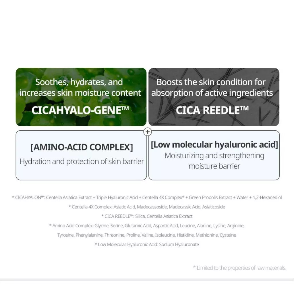 Centella Asiatica Extract + Centella 4X Complex* + Green Propolis Extract + Triple Hyaluronic Acid